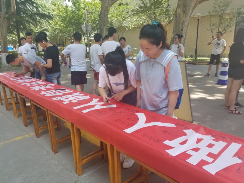 随着下课铃声的响起,同学们陆续从教学楼走出来,当看到拉起的“诚信考试”的横幅时,都纷纷停下去食堂的脚步,积极参与到签名活动中来。在短短的十分钟不到的时间里,长长的横幅上已经签满了密密麻麻的名字,在场的全体同学都表示不仅要在期末考试中“诚信”考试,在以后的生活、工作和做人都做到诚实诚信。