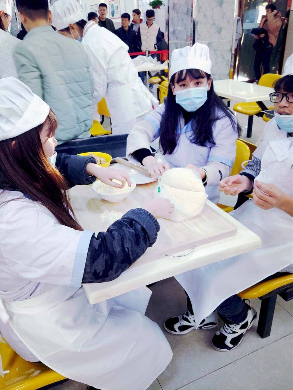 主持人悉心讲解了比赛要求和制作过程后比赛正式开始。食堂的师傅拿出了预先准备好的饺子馅、面团及其他工具。同学们积极性很高,迫不及待地换上厨师的衣服尝试起来,由于很多同学都是第一次包饺子,所以擀出来的饺子皮儿大小不一,但依旧抵挡不住对本次活动的热情,大家纷纷围坐在桌前,细心的向其他人学习,并在规定时间内互相配合包出相应的饺子数。比赛时间很快过去,大家纷纷展示出自己的劳动成果。虽然包出的饺子各式各样,但幸运的是出锅的饺子露馅的并没有多少。同学们吃着自己包出的饺子感觉特别香,还忍不住尝试其他人的饺子,评委们吃过后更是赞不绝口。评出了团体一等奖,二等奖,三等奖和参与奖并为以上获奖的团体颁发奖品。活动期间,主持人不断与在场同学互动,趣味问答有关冬至的小知识。幸运的同学还领取了活动礼品。整个餐厅欢声笑语,空气中洋溢着冬日里暖暖的气息。大家既体验了一把包饺子的乐趣,也度过了一个快乐有意义的节日。