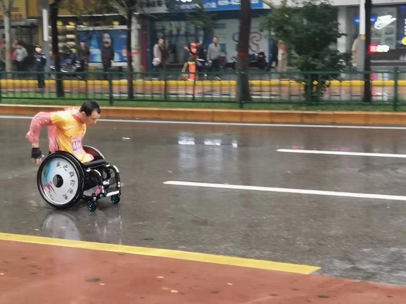 参加马拉松的勇士们先头部队过去之后,大部队来临。我校志愿者群情激奋,大声呐喊,把现场的活动氛围推向了高潮。这时候令人难忘的一幕出现了。只见一位坐在轮椅上的勇士,一只手一直推着轮椅过来了。将近30多公里路。他就这么一路推着过来了。他咬着牙还在推着,推着。他不仅仅是一位参加马拉松的勇士,更是一位不向命运低头的英雄。我校全体志愿者肃然起敬,大家一起用尊敬的目光和更加雄厚的加油声送着英雄离开。