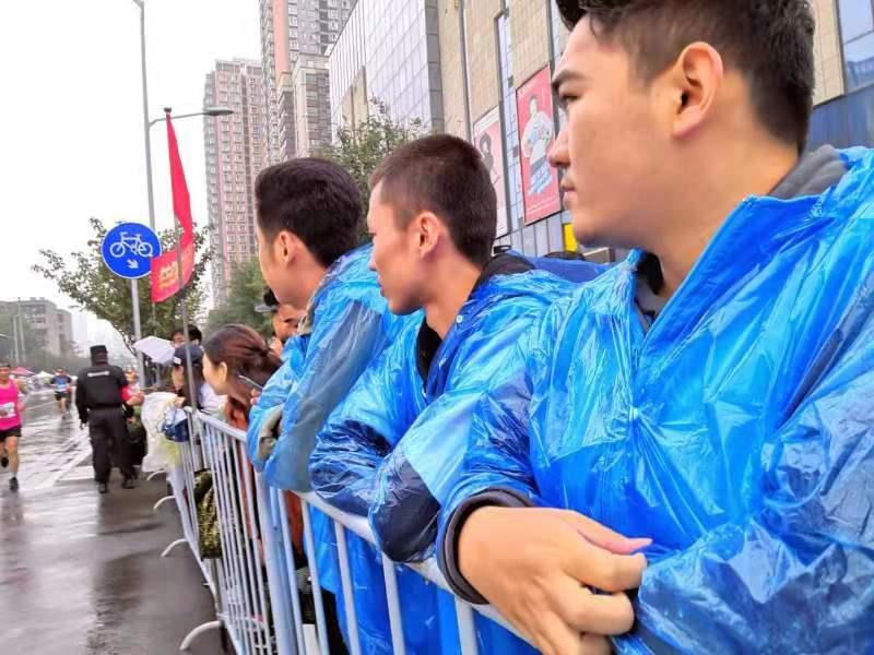 终于经过了焦急的等待,参赛者们跑到了我校志愿者所在的路段。运动员们都顶着大雨,已经连续跑了30多公里,他们是真正挑战极限的勇士。他们向我们展示了生命的活力和意志的顽强。我们被深深地感染。我校志愿者站在雨中用尽全身的力气。为勇士们呐喊加油。大家激动的挥舞着双手,用尽全身气力好似要把自己的力量灌输在勇士们的身上去。天空也好似感受到了大家的热情,不一会儿雨停了。